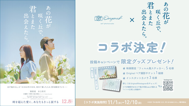 株式会社キャラット(本社:奈良県香芝市、代表取締役社長:佐野隆之)が運営するセルフ写真館「Original self photostudio(オリジナルセルフフォトスタジオ、以下Original) https://original.caratt.jp/ 」が、2023年12月8日(金)公開の映画「あの花が咲く丘で、君とまた出会えたら。(https://movies.shochiku.co.jp/ano-hana-movie/)」とコラボ。レトロ風の写真が撮れる限定撮影プランをご用意する他、抽選でオリジナルフィルム風ステッカー(非売品)やペアチケットなどが当たるSNS投稿キャンペーンを、2023年11月1日(水)から12月10日(日)の期間で実施します。