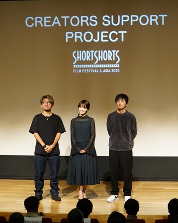 クリエイターズ支援プロジェクトの3作品の上映に続き、剛力彩芽さんがステージに登壇。「3作品を一気にスクリーンで見た」と喜びの表情を見せ、MCから、「3年前に撮影した作品ですが、覚えていますか?」という問いかけに、「記憶がよみがえった。短い期間で3つの異なる作品をそれぞれ撮影した、大変だったけど大きな挑戦ができて楽しかった」と語り、トークイベントがスタートしました。