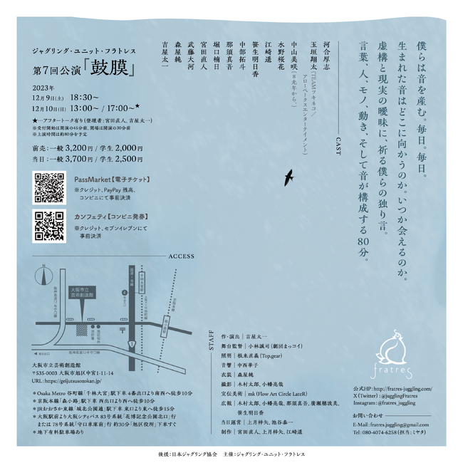 ジャグリング・ユニット・フラトレス主催、第7回公演『鼓膜』が2023年12月9日 (土) 〜2023年12月10日 (日)に大阪市立芸術創造館(大阪府大阪市旭区中宮1-11-14)にて上演されます。 チケットはカンフェティ(運営:ロングランプランニング株式会社、東京都新宿区、代表取締役:榑松 大剛)にて発売中です。