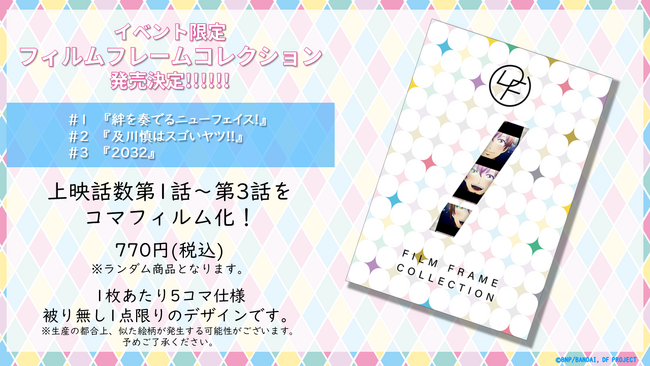 さらに、本上映で初登場となるイベント限定グッズ「フィルムフレームコレクション」の発売も決定!今回の上映話数である『ドリフェス!』第1話〜第3話の映像をコマフィルム化しランダム封入、すべてが“被り無し1点限り”のデザインとなるスペシャルなアイテムです。