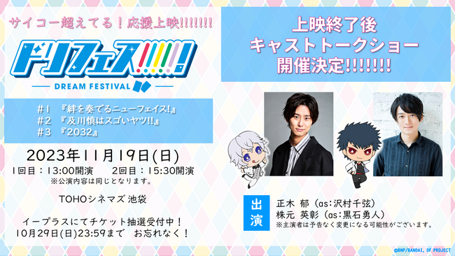 5次元(2次元+3次元)アイドル応援プロジェクト『ドリフェス!』シリーズの応援上映を、ファン待望の声出し応援解禁で11月19日(日)に実施! さらに上映終了後には正木 郁(as:沢村千弦)、株元英彰(as:黒石勇人)が登壇してのミニトークショーも開催されることや、イベント限定商品「フォトフレームコレクション」が発売されることが決定しました!