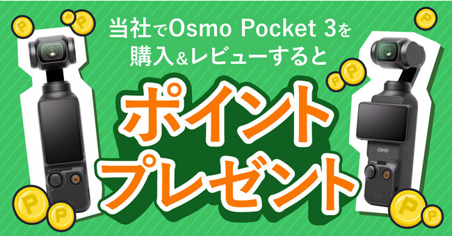 本キャンペーンは、10月25日(水)にDJIより発売された「Osmo Pocket 3」を当社から購入いただいたお客様限定のキャンペーンです。商品レビュー投稿が掲載されると、次回のお買い物でご利用いただける5,000円分のポイントをもれなくプレゼントいたします。