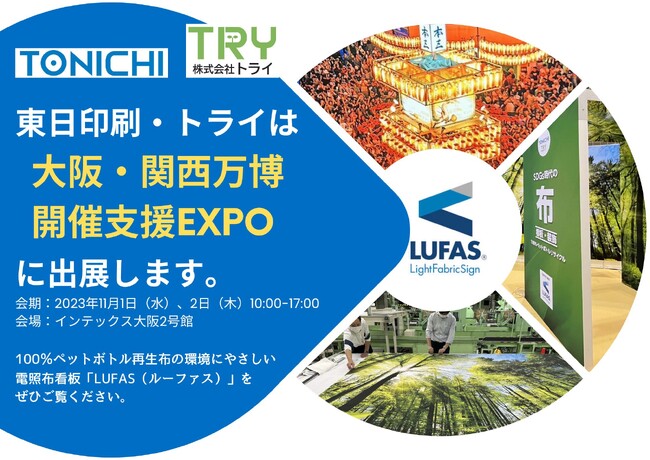 東日印刷株式会社(本社:東京都江東区〈https://tonichi-printing.co.jp/〉)とグループ企業の株式会社トライ(東京都江東区〈https://try-oa.com/〉)は、11月1日(水)と2日(木)にインテックス大阪で開催される「第4回大阪・関西万博開催支援EXPO(以下、万博開催支援EXPO)https://osakakansai-expo.jp/」に出展いたします。展示会では、当グループが製造・販売をしている100%ペットボトル再生布を使った電照布看板「LUFAS(R)(以下、ルーファス)」を紹介し、ブース装飾やデザインサイネージをご検討の企業様にお役立ていただけるご提案をいたします。