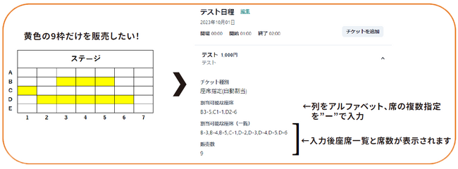 複雑な座席配置の会場チケットを販売したいときや他のプレイガイド販売で空いた座席のみ売りたいとき、ピンポイントで販売したい席を設定可能です。