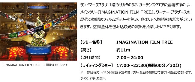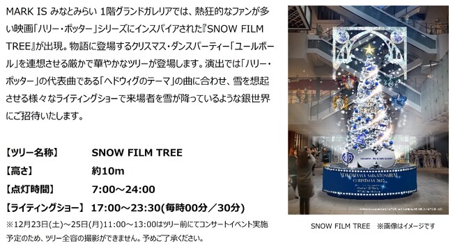 今年100周年を迎えたワーナー・ブラザースと3施設は、みなとみらい地区のクリスマスを彩る様々なコラボレーションを実現いたします。横浜ランドマークタワーでは、ランドマークプラザ 1階にワーナー・ブラザースの歴代の物語のフィルムに包まれたメインツリー『IMAGINATION FILM TREE』が設置され、各フロアにはアーティストとのコラボ作品やフォトスポットなどが展示されます。69階展望フロア「スカイガーデン」では、「BATMAN」がテーマの特別展示や同フロア内「スカイカフェ」にてコラボドリンク&デザートを販売します。MARK IS みなとみらいでは、映画「ハリー・ポッター」シリーズにインスパイアされた『SNOW FILM TREE』の展示や、「ハリー・ポッター」に関する最新コンテンツを堪能することができる「魔法ワールドギャラリー」を展開します。スカイビルには、「トムとジェリー」と「ルーニー・テューンズ」をモチーフにした『ANIMATION FILM TREE』や、アニメーションのスケッチ画(複製)が展示されます。