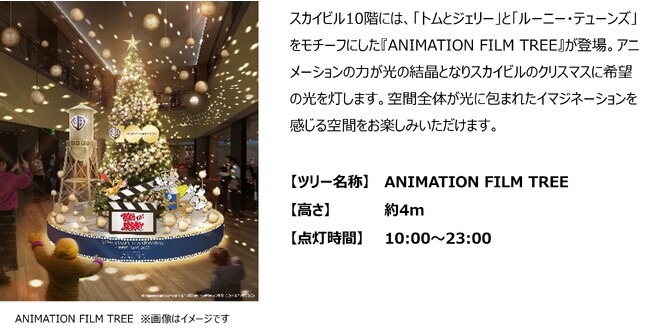 ツリーが展示されている10階には、「トムとジェリー」と「ルーニー・テューンズ」のスケッチ画(複製)を展示。アニメーションの空想世界を作り上げている緻密で繊細なスケッチを間近で体感することができます。11階には、「トムとジェリー」のフォトスポットを設置。メインツリーのイルミネーションと一体感のある写真を撮影することができます。