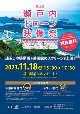 一般社団法人瀬戸内ドローン推進協議会【広島県福山市】は、ドローンで空撮した動画作品を映画館のスクリーンで上映できるイベントを2023 年11 月18 日(土)に開催!全国より多数のご応募頂いた作品の中から2つの部門を設けグランプリを決定いたします。