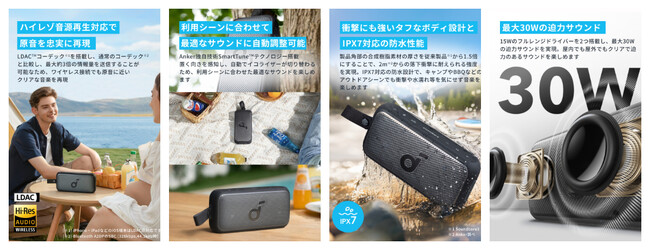 本製品は、「アウトドアでも高音質なスピーカーで音楽を楽しみたい」という方に最適な機能性と耐久性を兼ね備えたBluetoothスピーカーです。ハイレゾ音源再生が可能なLDAC(TM)コーデックに対応しているため、通常のコーデック(※1)と比較し、最大約3倍の情報量を送信することができ、ワイヤレス接続でも原音に近いクリアな音楽を再現します。また、15Wのフルレンジドライバーを2つ搭載しているのに加え、BassUp(TM)テクノロジーにより、最大30W出力のパワフルな重低音を響かせることにより迫力のあるサウンドを実現しました。傾きを感知する重力センサーにより、スピーカーの置き方によって最適なサウンドにイコライザーが自動で切り替わるAnker独自のSmartTune(TM)テクノロジーを初搭載し、スピーカーが側面になる横置き時は落ち着いて音楽が広がるバランスモード、ストラップで吊り下げ時は迫力あるダイナミックモード、スピーカーが天面になる平置き時は音が全方位に広がる360°モードに自動で変更できます。