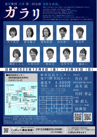 表現集団式日(代表:佐白啓)主催、『ガラリ』が2023年12月8日 (金) 〜2023年12月10日 (日)に麻布区民センター 区民ホールにて上演されます。 チケットはカンフェティ(運営:ロングランプランニング株式会社、東京都新宿区、代表取締役:榑松 大剛)にて発売中です。