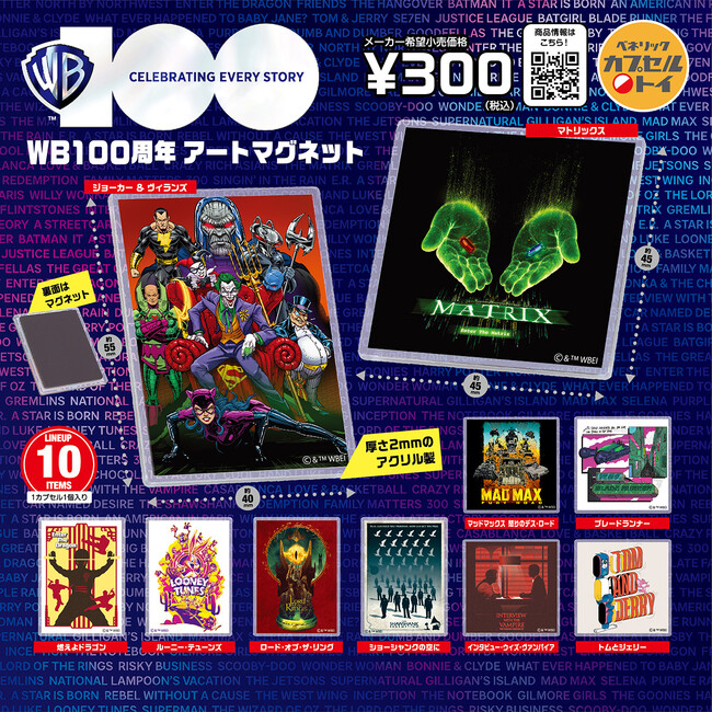 ベネリック株式会社(本社:東京都千代田区、社長:横山 武) は、ワーナー・ブラザース コンシューマープロダクツとのパートナーシップのもと、カプセルトイの新商品「WB100周年 アートマグネット」(全10種 / 1回300円・税込)を2023年11月上旬より順次、全国のカプセルトイ自販機コーナーにて発売いたします。