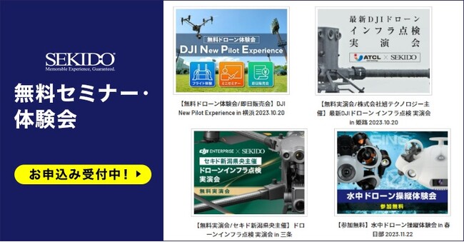 セキドでは、より多くの方にドローンを使った撮影や業務効率の改善を実現していただくため、ドローンや関連ソリューションをご紹介する無料セミナーやイベントを定期的に開催しております。今後もオンラインや全国各地での開催を予定しておりますので、ご興味をお持ちのイベントにはぜひお気軽にご参加ください。