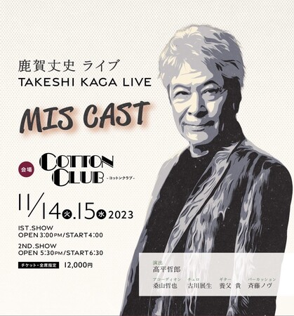 役者生活50周年を迎える鹿賀丈史が、これまでに出逢った選りすぐりの楽曲を披露するソロLIVE「MIS CAST」を11月14日、15日にCOTTON CLUBで開催。