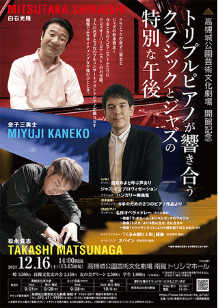 高槻城公園芸術文化劇場が保有するフルコンサートグランドピアノ3台が揃って舞台に初めて登場するコンサート「トリプルピアノが響き合うクラシックとジャズの特別な午後」を12月16日(土曜日)に開催。3台のピアノが奏でる優雅でエキサイティングな演奏をお楽しみください。