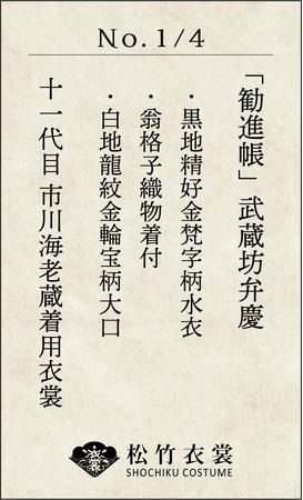 十三代目市川團十郎白猿が、海老蔵時代に舞台で実際に着用した衣裳を額装した、1メートルを超える巨大アートともいえる作品を、超特大写真集『十三代目市川團十郎白猿』とセットにしてお届けします。成田屋のお家芸「歌舞伎十八番」のなかでも特に人気のある《勧進帳》の弁慶の衣裳を使用。梵字や紋様を綺麗に切り出した3点を収めました。本人の存在を感じられるような作品です。また、超特大写真集には本人直筆のサインが入っています。B2サイズという写真集に相応しいアート作品を付けた、限定4部のスペシャルセットです。長辺約125.6cm、短辺約48.3cm、商品の重さ約7,700g、シリアルナンバー付