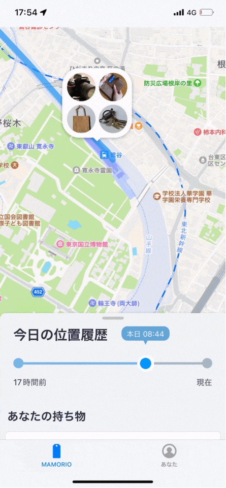 本機能の特徴的な点は、マップ上の移動経路を時間軸に沿って自由に確認できるようにした点です。これによりユーザーはMAMORIOをつけた持ち物を万が一置き忘れてしまった場合でも、その日の詳細な移動履歴を時間軸とともに確認していくことが可能となり、最後に持ち物があった場所や状況を詳細に振り返ることができることで関係各所への問い合わせや持ち物の探索を迅速に行えるようになりました。