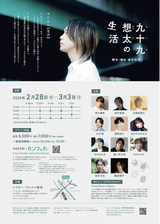 澁谷光平が主宰するプロデュース型ユニット、スプリングマンの新作舞台「九十九想太の生活」が 2024年2月28日(水)〜3月3日(日)、シアター・アルファ東京にて上演される。
