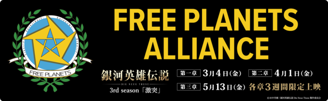 『銀河英雄伝説』は、遙か未来の宇宙を舞台にしたSF小説。数々のヒット作を生み出した人気作家、田中芳樹の代表作で、1982年に第1巻が刊行されて以来、本伝10巻、外伝5巻の大長篇小説として、累計1500万部のセールスを記録。今なお増刷が続いています。1988年からはアニメシリーズが展開され、さらに多くのファンを獲得しました。そして、2018年4月、Production I.Gが改めて新作アニメーションとして 『銀河英雄伝説 Die Neue These 邂逅』(全12話)を制作。そのセカンドシーズンとなる「星乱」(13話〜24話)も2019年に映画館でイベント上映され、新たな声優陣、最新の技術での艦隊戦、新たな解釈で描かれた本作は、銀河英雄伝説ファンのみならず、幅広いアニメファンに話題となりました。2020年4月からはOP、EDを新たにした全24話がNHK Eテレにて放送されました。続編となるサードシーズン「激突」全3章を2022年3月から3か月連続、全国36館の劇場で各章3週間限定にて上映致します。