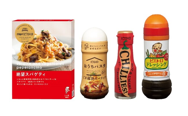 ※「洋麺屋ピエトロ パスタソース 絶望スパゲティ」「おうちパスタ ごま醤油ガーリック」「ピエトロ CHILLIES!(チリーズ)」「ピエトロドレッシング 和風しょうゆ」の4点セットです。