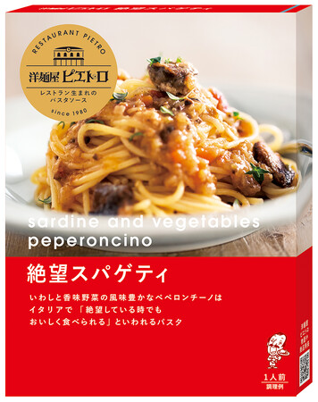 “絶望している時でもぺろりと食べられるおいしさ”が名前の由来の、鰯と香味野菜の風味豊かなペペロンチーノ。身のやわらかさが特長の国産マイワシと、細かく刻んだ香味野菜をたっぷり使用し、鰯の旨みと野菜の香りと甘みをお楽しみいただけます。ゆでたパスタに温めたパスタソースをかけるだけで、簡単に本格的な一品ができあがります。