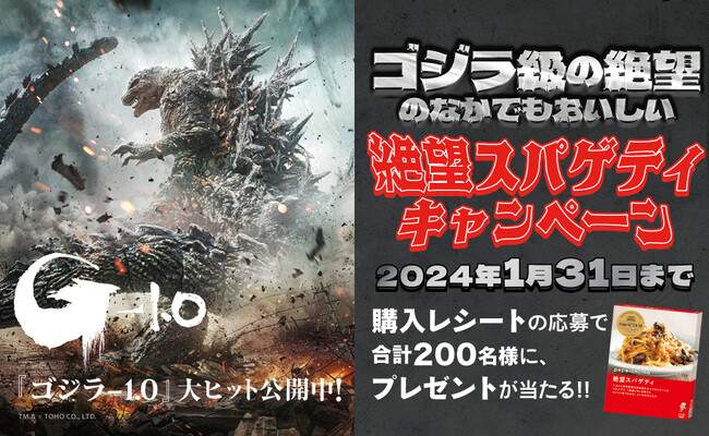 株式会社ピエトロ(本社:福岡市中央区、代表取締役社長 高橋 泰行)は、2023年11月17日(金)〜2024年1月31日(水)の期間、『ゴジラ級の絶望のなかでもおいしい 絶望スパゲティキャンペーン』を開催いたします。 絶望の象徴が蘇る大ヒット公開中の『ゴジラ-1.0』の公式グッズや、“絶望している時でもぺろりと食べられるおいしさ”が名前の由来である、ピエトロの人気レトルトパスタソース「絶望スパゲティ」など、ゴジラ級のプレゼントが抽選で合計200名様に当たります。