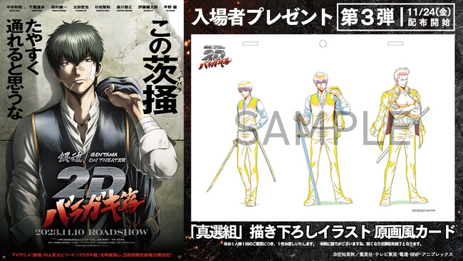 上映最終週となる11月24日(金)より配布される第3弾【「真選組」描き下ろしイラスト 原画風カード】は、本上映のために新規で描き下ろされた「真選組」土方十四郎・近藤勲・沖田総悟のビジュアルを、原画風にデザインしたA4サイズのカード。