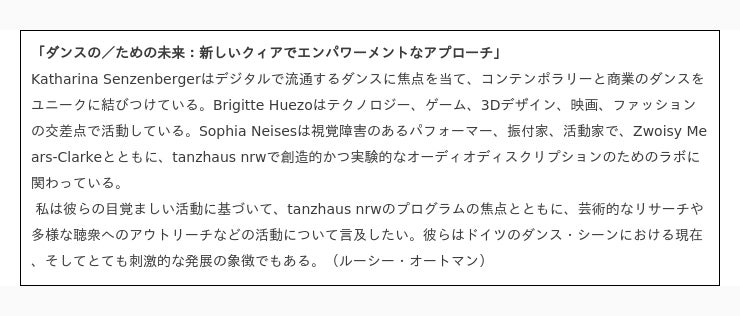 ドイツのダンス専用劇場、tanzhaus nrwののドラマトゥルク、ルーシー・オートマンが未来を志向するコンテンポラリー・ダンスの実践を紹介します。