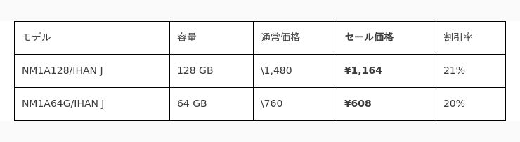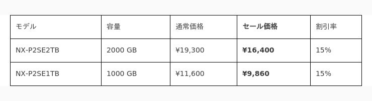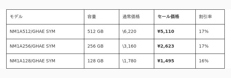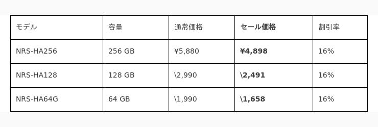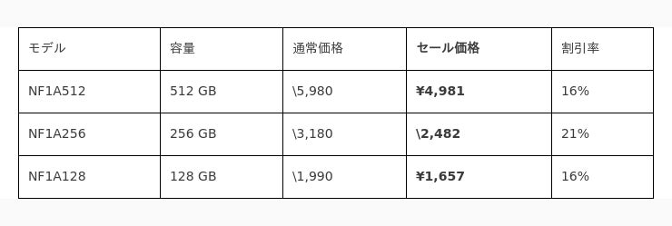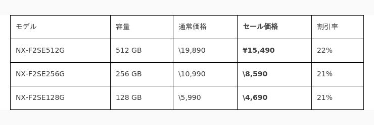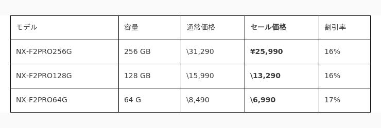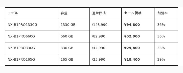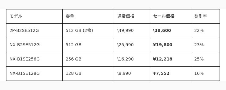 年に一度のビッグセールに際し、クラス最高レベルの転送速度と800MB/sの最低継続書き込む速度を持つNX-B2SE512G(512GB)を過去最安値同額の¥19,800で販売します。また、NX-B1PROシリーズが最大36%OFFなど、全27製品がこれまで以上にお求めやすい価格となっております。