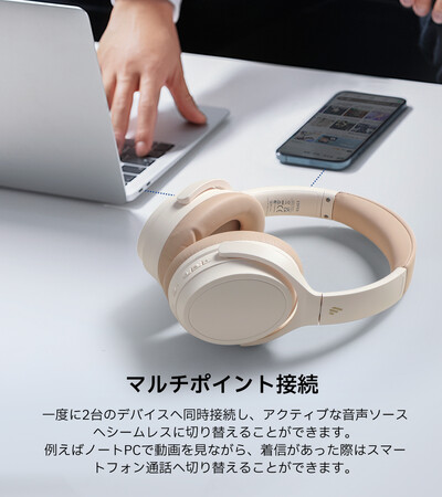 IOS、Android、PCなど、異なるデバイスとのマルチポイント接続が可能。スマートフォンで音楽を楽しみながら、PCでのWEB会議もスムーズに切り替えて楽しむことができます。