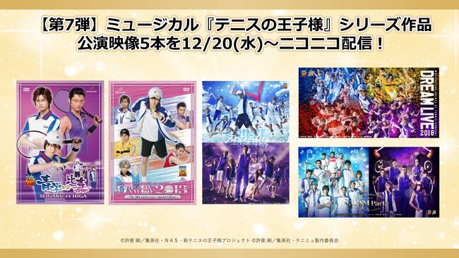 2023年5月より、シリーズ20周年記念企画として「ニコニコ」では、ミュージカル『テニスの王子様』・ミュージカル『新テニスの王子様』の公演映像を配信中! 2023年12月20日(水)より、第7弾として公演映像5本を新たにお届けいたします。コメントで盛り上がりながら、ニコニコでテニミュを楽しみましょう!