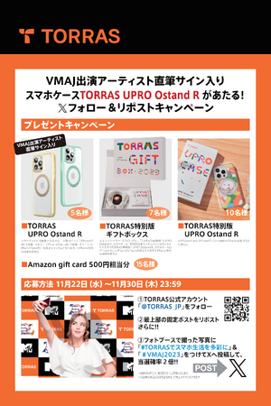 固定ポスト(11月22日午後1時投稿予定)をリポストすると、抽選でサイン入りスマホケース、TORRAS特別版ギフトボックス、TORRAS特別版UPRO Ostand RとAmazonギフトカードが当たります!