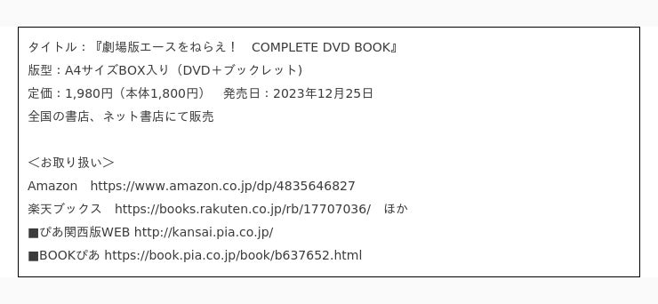 ぴあ株式会社より、『劇場版エースをねらえ!COMPLETE DVD BOOK』を12月25日に発売することが決定しました。