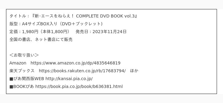 原作連載・アニメ放送開始50周年『新・エースをねらえ! COMPLETE DVD BOOK vol.3』本日発売