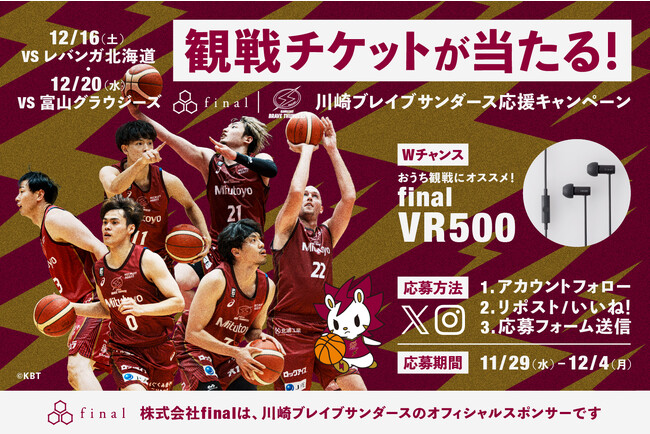 川崎ブレイブサンダースを応援しよう! 観戦チケットやfinalの新製品イヤホン「VR500 for Gaming」が当たる「final・川崎ブレイブサンダース応援キャンペーン」開催!