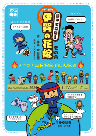 方南ぐみ企画公演「帰ってこい! 伊賀の花嫁 その六」そうだ! We're Alive 編を俳優座劇場(〒106-0032 東京都港区六本木4-9-2)にて2024年1月17日(水)〜10月21日(日)に上演することが決定しました。チケットはカンフェティ(運営:ロングランプランニング株式会社、東京都新宿区、代表取締役:榑松 大剛)にてファンクラブ先行販売中、12月16日(土)10:00より一般販売開始です。