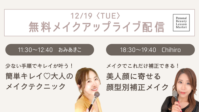 キヤノンマーケティングジャパン株式会社(代表取締役社長:足立正親 以下キヤノンMJ)は、オンラインメイクレッスン「Personal Beauty Lesson Market」(パーソナルビューティーレッスンマーケット、以下本サービス)が主催するメイクアップライブ配信を、2023年12月19日に開催します。配信は1日2回開催し、第1回ではメイク講師 おみあきこ氏が少ない手順で簡単にキレイを叶える大人世代のメイクテクニックを、第2回ではヘアメイクアップアーティスト Chihiro氏が顔の形に合わせて黄金比に寄せる補正メイクをご紹介します。