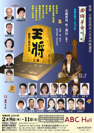 若獅子会プロデュース公演、おおさかバージョンVI『王将 -坂田三吉の生涯-』が2024年2月8日 (木) 〜2024年2月11日 (日・祝)にABCホール(大阪府大阪市福島区福島1丁目1番30号)にて上演されます。 チケットはカンフェティ(運営:ロングランプランニング株式会社、東京都新宿区、代表取締役:榑松 大剛)にて12月1日(金) 15:00より予約受付開始です。