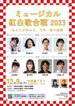合同会社Art&Artsは2023年12月9日(土)、中目黒トライにて「ミュージカル紅白歌合戦2023」を開催します。男女混合の紅組・白組を編成し、紅組は女性キャラクターの、白組は男性キャラクターのミュージカルナンバーを披露します。若手実力派俳優によってミュージカルナンバーが持つ魅力を余すことなくお届けする、今年で第五回を迎える大人気企画です。