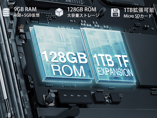 4GBのメモリ+5GBの拡張可能な仮想メモリ、合計9GBの融合メモリを搭載しています。これにより、タブレットは複数のアプリケーションを簡単かつスムーズに切り替えることができ、ラグをなくし、高速でスムーズな操作体験を提供します。128GBの大容量ストレージも搭載されているため、メモリ不足を心配する必要はもうありません。 大容量の1TBまでのmicroSDカードでストレージ容量をさらに拡張できます。(FAT32、exFATフォーマットカードは別売り)