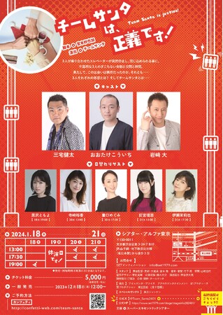 スーパーエキセントリックシアター主催、『チームサンタは、正義です!』が2024年1月18日(木)〜1月21日(日)にシアター・アルファ東京(恵比寿)(〒150-0011 東京都渋谷区東3-24-7 劇場B1F)にて上演されます。この度ビジュアルと日替わりゲストの豪華女性声優陣5人が決定しました。 チケットはカンフェティ(運営:ロングランプランニング株式会社、東京都新宿区、代表取締役:榑松 大剛)にて12月18日(月)12:00より発売開始です。
