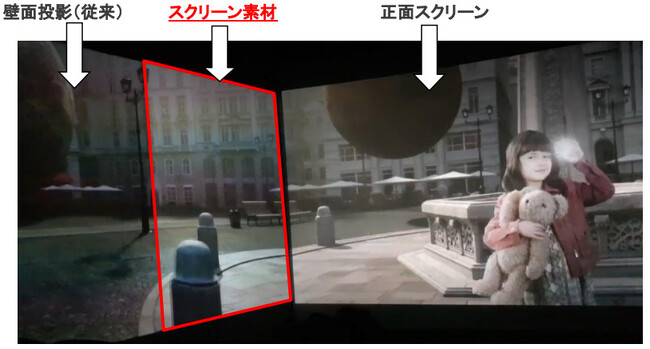最新スペック版は、左右の壁面に正面と同様のスクリーン素材を施工、また左右の映像を投影するプロジェクターもスペックアップすることで、正面と左右の3面スクリーンの映像が今まで以上に明るく一体化し没入感がさらに増大。今までの「ScreenX」から進化したプレミアムラージフォーマット仕様になっています。
