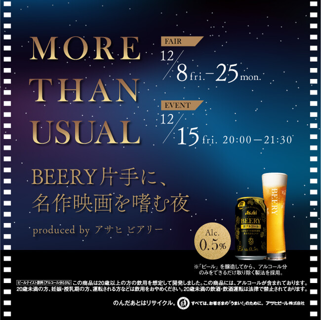 アサヒ「ビアリー」とFilmarksのコラボイベント『MORE THAN USUAL - BEERY片手に、名作映画を嗜む夜-』を12月15日(金)に六本木 蔦屋書店で開催