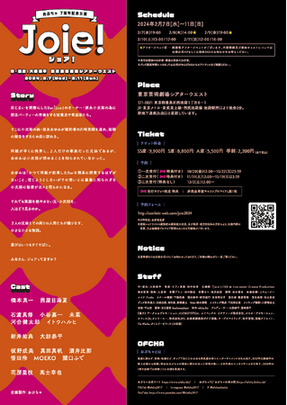 おぶちゃ(主宰:大部 恭平)主催、おぶちゃ7周年記念公演『Joie!』が2024年2月7日 (水) 〜2024年2月11日 (日・祝)に東京芸術劇場 シアターウエスト(東京都東京都豊島区西池袋1丁目8番1号)にて上演されます。 チケットはカンフェティ(運営:ロングランプランニング株式会社、東京都新宿区、代表取締役:榑松 大剛)にて発売中です。