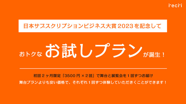 「お試しプラン」は初回2ヶ月のお届け限定<3500円/月×2ヶ月>で舞台と展覧会をそれぞれ1回ずつお届けするプランです。舞台プラン(7,900円)よりも安い価格で、舞台と展覧会を1回ずつ体験できるので、大変おトクになっています。まずはrecriのサービスを気軽にお試しいただき、お好みのジャンルを見つけていただきたいと考えております。
