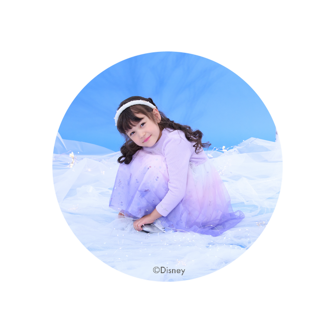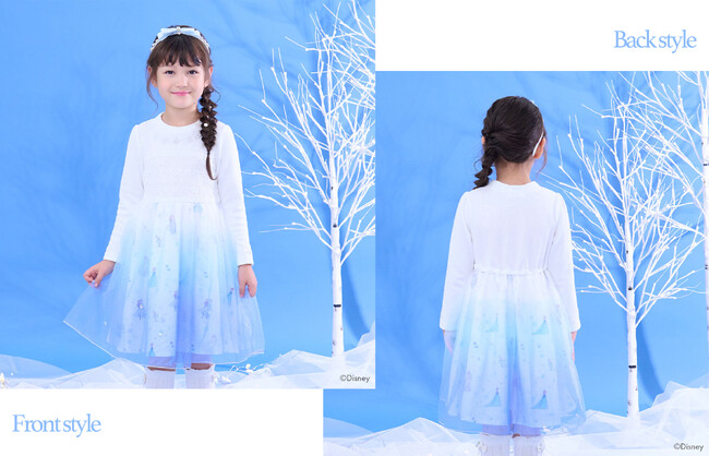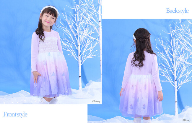 フロントの上品なレースと美しいグラデーションが印象的なワンピース。エルサをイメージしたブルーのグラデーションと、アナをイメージしたラベンダーのグラデーションの2色展開です。総柄に重ねたグラデーションチュールにはビジューがついた細部までこだわったデザインです。