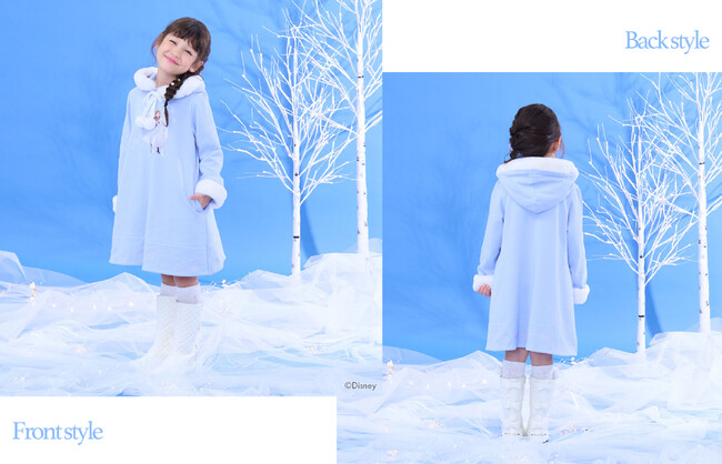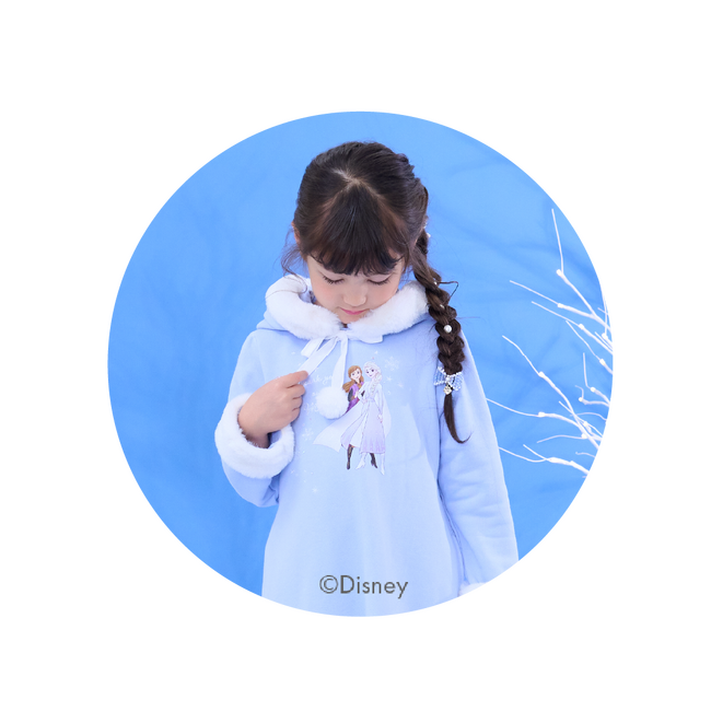 フードと袖口に付いたファーや、襟ぐりのリボンとファーポンポンでアナをイメージしたデザインのワンピースです(ハート)アナとエルサの繊細なプリントと刺繍が上品な印象に見せてくれます。エルサをイメージしたブルーと、アナをイメージしたラベンダーの2色展開です。