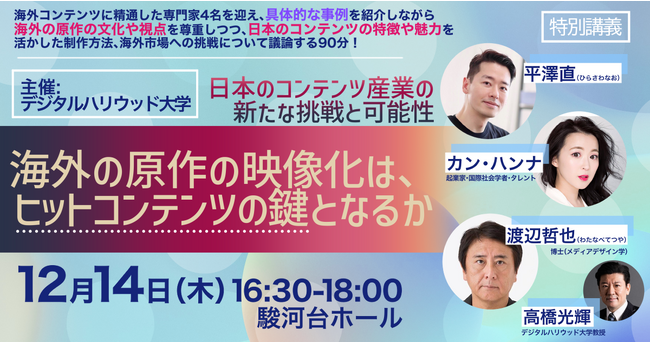 今回の特別講義では、専門家4名を迎え、具体的な事例を紹介しながら、海外の原作の文化や視点を尊重しつつ、日本のコンテンツの特徴や魅力を活かした制作方法、海外市場への挑戦について議論します。ぜひご参加ください。