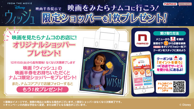 キャンペーン期間中、映画『ウィッシュ』の映画半券をお持ちのお客さま、またはナムコポイントアプリで対象店舗をフォローした方に、ナムコ限定「限定ショッパー」をプレゼントします。