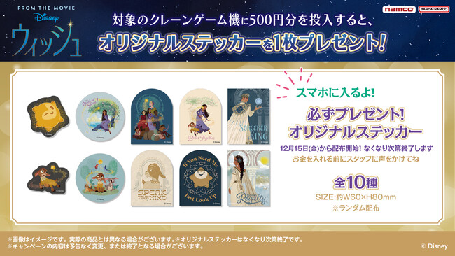 本キャンペーンでは、映画『ウィッシュ』のキャラクターがナムコ限定景品になって登場!さらにナムコの対象クレーンゲーム機に500円分を投入すると、オリジナルステッカーをプレゼントします。