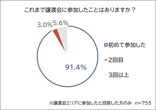 来場者アンケートを実施したところ、譲渡会エリアに参加して「初めて譲渡会に参加した」と回答した方が91.39%となり、今まで参加経験がなかった方にも多くご来場いただくことができました。