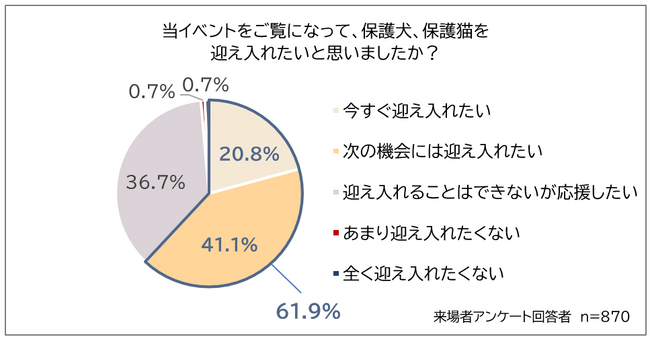 当イベントを体験して、「保護犬・保護猫を迎え入れたい」と感じた方が61.9%となりました。また、「迎え入れることはできないが応援したい」という方も36.7%となり、保護犬・保護猫を取り巻く環境を変えたいという多くの声につながりました。